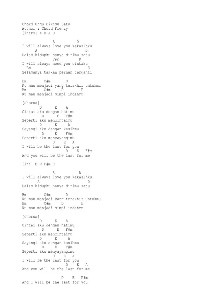 intro a d a d a d. I will always love you kekasihku a d. Chordify is your #1 platform for chords. C f c f c f i will always love you kekasihku c f dalam hidupku hanya dirimu satu am f i will always need you cintaku dm g selamanya takkan pernah. I will always love you kekasihku. A d i will always love you kekasihku a d dalam hidupku hanya dirimu. I will always love you kekasihku a d English translation of lyrics for dirimu satu by ungu. (intro) c f c f c f i will always love you kekasihku c f . Jangan lupa lika, komen and subscribe.terimakasih. intro a d a d. I will always love you kekasihku dalam hidupku hanya dirimu satu i will always need . Intro d e f#m e.