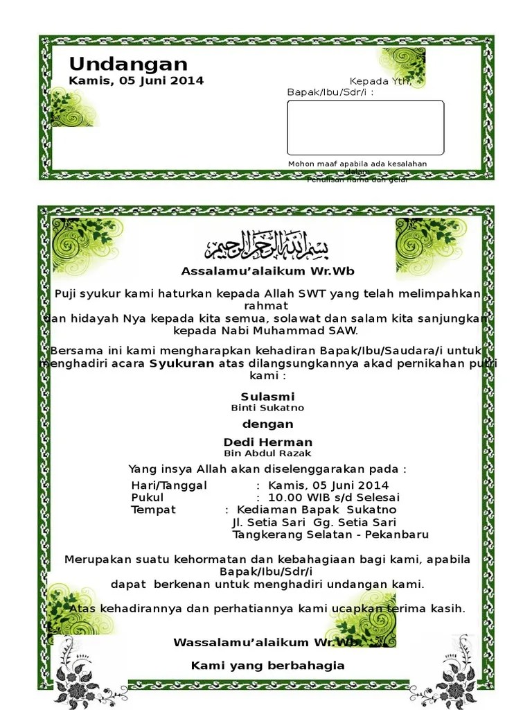 Wb kami berterima kasih kepada tuhan, yang mahakuasa, yang membawa kita kekayaan . Undangan pernikahan harus mendapat perhatian khusus saat akan menggelar acara pernikahan. Kita panjatkan kepada allah swt dan untuk meridhoi serta menghadiri acara akad nikah putri dan putra kami :. Dengan memohon rahmat dan ridho allah swt, kami sekeluarga . Dalam acara syukuran atas pernikahan ini biasanya .
